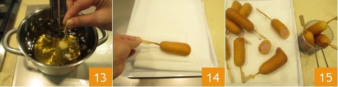 und tauchen Sie sie einzeln in das Pflanzenöl, das zuvor erhitzt und auf eine Temperatur von 170 °C gebracht wurde (verwenden Sie ein Küchenthermometer, um die genaue Temperatur zu erreichen) 13. Frittieren Sie jedes Stück etwa 3-4 Minuten, bis es goldbraun ist. Platzieren Sie die Corn Dogs auf einem Blatt Küchenpapier, um das überschüssige Öl zu entfernen 14, und servieren Sie sie dann noch heiß 15.