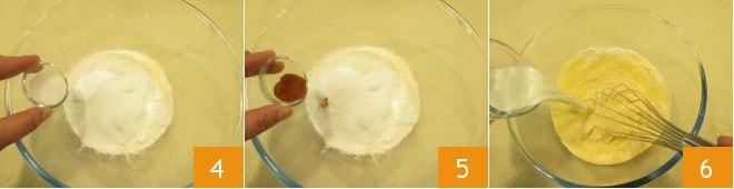 Dann fügen Sie das Natron 4 und das Paprikapulver 5 hinzu. Nehmen Sie nun einen Schneebesen und beginnen Sie, die Zutaten zu vermischen, während Sie nach und nach die Milch bei Raumtemperatur hinzufügen 6.