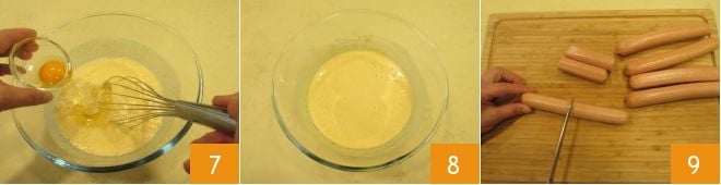 Fügen Sie ein Ei hinzu 7 und schlagen Sie weiter, bis Sie eine klumpenfreie und ausreichend dicke Masse erhalten 8. Gießen Sie den Teig in einen hohen, zylindrischen Behälter und stellen Sie ihn beiseite. Nehmen Sie nun die Würstchen und schneiden Sie sie in der Mitte durch 9.