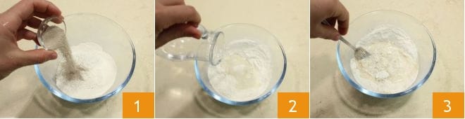 Um den Hefekranz mit Aprikosen und Moscato zuzubereiten, beginnen Sie mit dem Vorteig, also dem Basisteig, der für eine stärkere Teiggärung sorgt. Sieben Sie in einer Schüssel das Mehl, fügen Sie die Trockenhefe 1 und nach und nach das Wasser 2 hinzu, vermengen Sie alles mit einem Löffel, um die Zutaten zu sammeln 3. (Sie können auch frische Hefe verwenden, in diesem Fall beträgt die zu verwendende Menge 12 g).