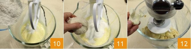 Tauschen Sie den Schneebesen gegen den Flachrührer und fügen Sie das gesiebte Mehl 10 und den Vorteig 11 hinzu, kneten Sie alles einige Minuten lang. Wenn alles gut vermischt ist, entfernen Sie den Flachrührer und setzen Sie den Knethaken ein, fügen Sie dann die Butter bei Raumtemperatur stückweise hinzu 12, warten Sie, bis das vorherige Stück aufgenommen wurde, bevor Sie das nächste hinzufügen.