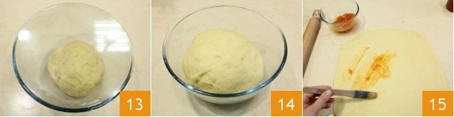 Wenn der Teig gut am Haken befestigt ist und glatt und elastisch wirkt, übertragen Sie ihn in eine große Schüssel, decken Sie ihn mit Frischhaltefolie ab 13 und lassen Sie ihn 2 Stunden in einem ausgeschalteten Ofen mit eingeschaltetem Licht gehen. Nehmen Sie den gegangenen Teig 14, rollen Sie ihn zu einem dünnen Rechteck von 2-3 mm Dicke und etwa 37 x 54 cm Größe aus. Sie können die Arbeitsfläche bei Bedarf buttern, damit der Teig nicht klebt. Bestreichen Sie den Teig mit Aprikosenmarmelade und lassen Sie etwa 1 cm Rand frei 15.