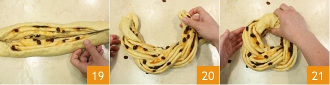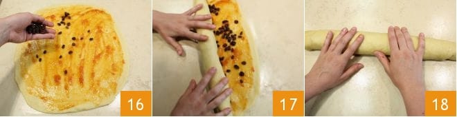 Streuen Sie die Rosinen darüber 16 und rollen Sie den Teig von der längeren Seite her auf (17-18). Legen Sie den Verschluss unten.