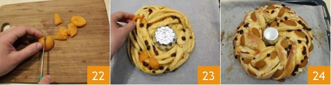 Nehmen Sie die in Moscato eingelegten Aprikosen: Öffnen Sie sie und entfernen Sie den Kern, schneiden Sie sie in Viertel 22, dann übertragen Sie den Kranz auf ein mit Backpapier ausgelegtes Blech und legen Sie in die Mitte eine runde Form aus Aluminium (geeignet für den Backofen), die hilft, die Kranzform während des Backens zu erhalten; verteilen Sie die in Viertel geschnittenen Aprikosen zwischen den Falten des Kranzes rund um den Umfang 23. Decken Sie den Kranz vorsichtig mit Frischhaltefolie ab und lassen Sie ihn eine weitere Stunde in einem ausgeschalteten Ofen mit eingeschaltetem Licht gehen. Nach dem letzten Gehen fügen Sie die Mandelblättchen auf der Oberfläche hinzu und backen Sie in einem vorgeheizten statischen Ofen bei 180° für 40-45 Minuten (oder in einem Umluftofen bei 160° für 35-40 Minuten). Nehmen Sie Ihren Hefekranz mit Aprikosen und Moscato 24 aus dem Ofen und lassen Sie ihn etwas abkühlen, bevor Sie ihn servieren.