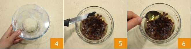 und arbeiten Sie dann von Hand weiter auf der Arbeitsfläche, um eine schöne glatte Mischung zu erhalten; legen Sie diese in die Schüssel und decken Sie sie mit Frischhaltefolie ab 4. Lassen Sie sie eine Stunde in einem ausgeschalteten Ofen mit eingeschaltetem Licht oder in einem warmen Raum gehen. In der Zwischenzeit widmen Sie sich der Füllung: Waschen Sie die Rosinen und weichen Sie sie in etwa 40 ml Moscato-Sirup (entnommen aus der Gesamtdosis von 200 ml) ein, um sie aufzuweichen und zu aromatisieren, fügen Sie auch die Samen einer Vanilleschote 5 und einen Esslöffel Honig 6 hinzu, lassen Sie alles etwa eine Stunde lang ziehen.
