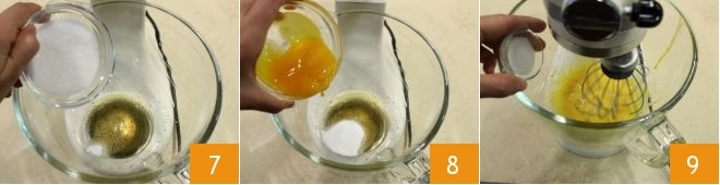 Geben Sie in eine Küchenmaschine mit Schneebesen den restlichen Moscato-Sirup, den Zucker 7, die Eigelbe 8 und das Salz 9, schlagen Sie alles schaumig und luftig auf.