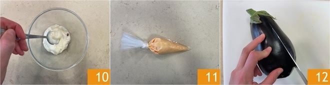 Vermengen 10, in einen weiteren Spritzbeutel geben 11 und im Kühlschrank aufbewahren. Nun zu den Auberginen: Entfernen Sie die seitlichen Enden, dann schneiden Sie sie in 4 Scheiben, lassen Sie sie jedoch am Stiel befestigt 12.