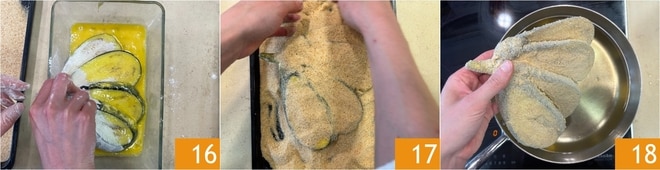 Tauchen Sie sie dann in das geschlagene Ei 16 und bedecken Sie sie schließlich mit Semmelbröseln 17. Erhitzen Sie nun das Pflanzenöl in einem Topf zum Frittieren und sobald es 180° erreicht hat, tauchen Sie die panierte Aubergine ein 18.