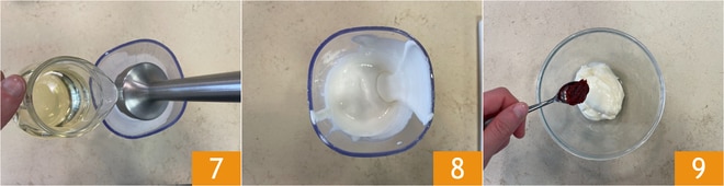 Beginnen Sie mit einem Stabmixer zu mixen, während Sie das Öl langsam dazugeben 7, bis Sie eine mayonnaiseartige Konsistenz erreichen 8. Geben Sie die Sauce in einen Spritzbeutel und stellen Sie sie in den Kühlschrank. Gehen Sie nun zur Chilisauce über: In einer Schüssel die Mayonnaise mit der Chilipaste vermischen 9.