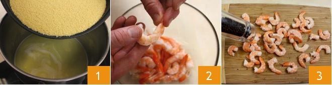 Um den Couscous mit Erbsen und Garnelen zuzubereiten, beginnen Sie mit dem Couscous; geben Sie in einen Topf 270 ml Wasser, erhitzen Sie es und fügen Sie eine Prise Salz, zwei Esslöffel Olivenöl extra vergine und die Schale einer Zitrone hinzu. Wenn das Wasser zu kochen beginnt, den Couscous einrieseln lassen 1, umrühren und dann die Hitze ausschalten. Fügen Sie die Butter hinzu und glätten Sie den Couscous mit einem Löffel, lassen Sie ihn 2 Minuten lang ruhen, damit der Grieß das Wasser aufsaugt. Schälen Sie die Garnelen 2 und entfernen Sie auch den Schwanz; salzen und pfeffern Sie 3