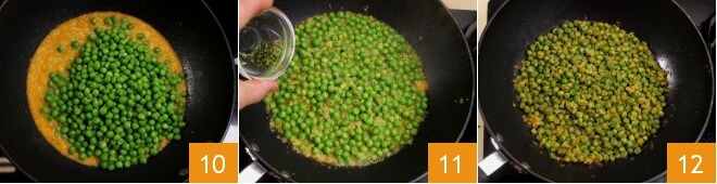 und kochen Sie bei schwacher Hitze 5 Minuten lang weiter. Fügen Sie die Erbsen hinzu 10, salzen und pfeffern Sie leicht 12. Fügen Sie den Erbsen einen Teil der gehackten Kräuter hinzu 11 und kochen Sie sie etwa 10 Minuten lang, bis die Erbsen weich sind 12, fügen Sie bei Bedarf wenig Wasser hinzu, falls sie zu trocken werden.