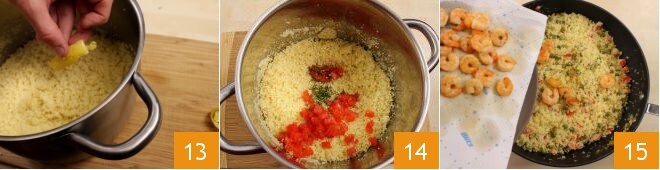 In der Zwischenzeit entfernen Sie die Zitronenschale vom Couscous 13 und fügen die restlichen gehackten Kräuter und die Tomatenwürfel hinzu 14, rühren Sie um und fügen alles zu den Erbsen direkt in der Pfanne bei schwacher Hitze hinzu. Gut umrühren, falls nötig etwas Olivenöl extra vergine hinzufügen und schließlich die Garnelen 15. Schalten Sie die Hitze aus, vermengen Sie den Couscous und servieren Sie ihn in kleinen Tajine-Portionen, heiß oder, wenn Sie es vorziehen, kalt.