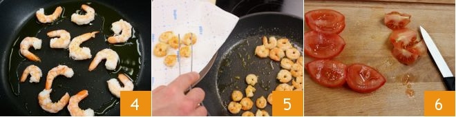und braten Sie sie in einer Pfanne, in der Sie 3 Esslöffel Olivenöl erhitzt haben, bei mittlerer Hitze 5 Minuten lang an, bis sie auf beiden Seiten goldbraun sind 4. Legen Sie die Garnelen, nachdem sie gekocht sind, auf Küchenpapier, damit sie das überschüssige Öl verlieren 5. Vierteln Sie die Tomate und entfernen Sie mit einem Messer das Fruchtfleisch und die Samen 6