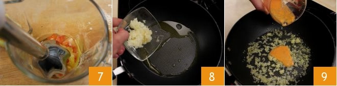 die Sie zusammen mit einer Prise Salz, einer Prise Pfeffer, einem Esslöffel Öl und der Schale einer halben Zitrone pürieren 7; schneiden Sie die Tomatenviertel in kleine Würfel und legen Sie sie beiseite. Hacken Sie den Thymian und den Majoran und legen Sie sie beiseite; hacken Sie die Zwiebel fein und braten Sie sie in einer Pfanne mit 2 Esslöffeln Olivenöl an 8; sobald sie zu brutzeln beginnt, fügen Sie den pürierten Tomatensaft hinzu 9