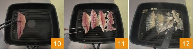 Erhitze eine Grillplatte und lege die Makrelenfilets darauf 10, brate sie 3 Minuten auf der Hautseite und 2 Minuten auf der anderen Seite 12.