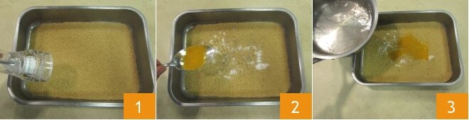 Um den Couscous mit Apfel, Makrele und Salmoriglio zuzubereiten, kümmere dich zunächst um den Couscous: Gib ihn in eine Schüssel, salze 1, pfeffere und würze mit einem Teelöffel Kurkuma 2. In einem separaten Topf bringe Wasser zum Kochen und gieße es dann heiß über den Couscous 3.