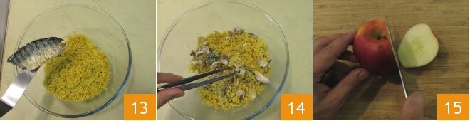 Abkühlen lassen und dann die Makrele zum Couscous hinzufügen 13, indem du sie grob zerkleinerst 14. Jetzt die Äpfel waschen, das Kerngehäuse entfernen und dann zuerst in Scheiben schneiden 15.