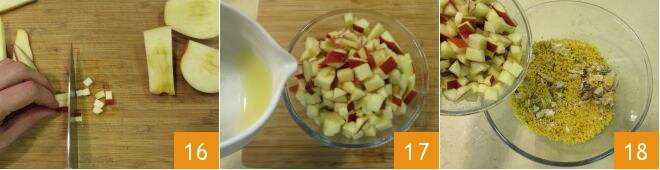 Und dann in 1 cm große Würfel schneiden 16. Du erhältst etwa 360 g Äpfel. In eine Schüssel geben und mit Zitronensaft beträufeln, damit der Apfel nicht braun wird 17. Gib die Äpfel zum Couscous 18 und stelle sie beiseite.