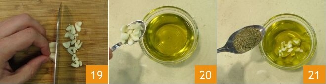 Bereite den Salmoriglio vor: Hacke den Knoblauch 19 und füge ihn dem Öl hinzu 20, dann würze mit getrocknetem Oregano 21.
