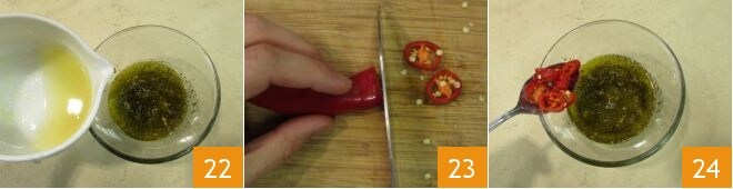 Gib auch den Zitronensaft hinzu 22. Schneide nun die frische Chilischote in Ringe 23 und füge sie dem Salmoriglio hinzu 24.