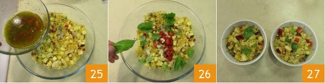Würze den Couscous mit dem Salmoriglio 25 und verfeinere ihn mit frischen Basilikumblättern 26. Der Couscous mit Apfel, Makrele und Salmoriglio ist servierfertig 27.