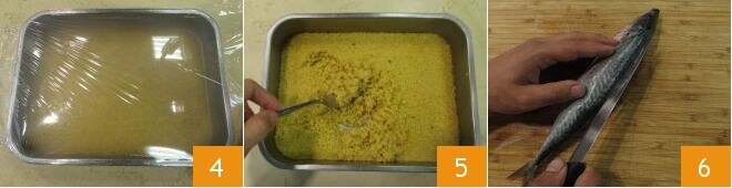 Decke die Schüssel mit Frischhaltefolie 4 ab und lasse sie 3 Minuten ruhen. Nach dieser Zeit den Couscous aufdecken und mit einem Löffel auflockern 5. Gib den Couscous in eine große Schüssel und stelle ihn beiseite. Jetzt bereite die Makrele vor: Nachdem du sie ausgenommen und unter fließendem Wasser abgespült hast, schneide den Rücken tief bis zur Gräte ein 6.