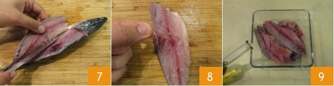 um das Fleisch von der Mittelgräte zu trennen 7. Entferne die Gräten 8 und lege die Filets in eine Schüssel (du erhältst etwa 300 g saubere Filets) und würze sie mit Olivenöl 9.