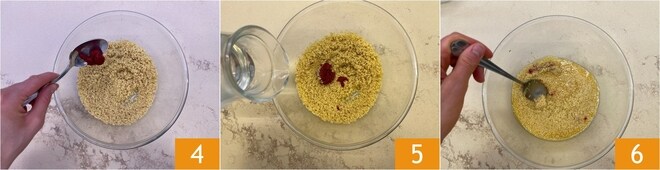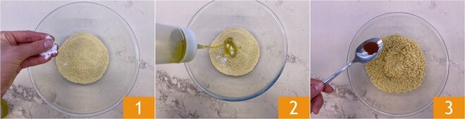 Um den Couscous mit Lachs und Feta zuzubereiten, geben Sie den Couscous in eine große Schüssel und würzen ihn mit einer Prise Salz 1, einem Schuss Olivenöl extra vergine 2 und einem Teelöffel süßem Paprikapulver 3.