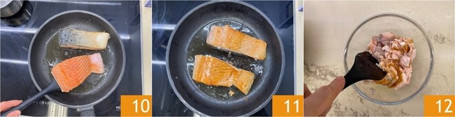 Braten Sie sie 3-4 Minuten pro Seite, bis sie außen goldbraun und innen noch weich und saftig sind 10. Sobald sie fertig sind 11, nehmen Sie den Lachs vom Feuer und zerteilen ihn grob 12.