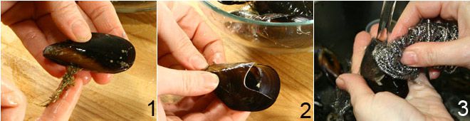 Zupfen Sie von jeder Miesmuschel das aus dem Gehäuse ragende Bärtchen (Byssus)1 ab, verwerfen Sie die zerbrochenen 2 und reinigen Sie die Schale der restlichen gründlich, indem Sie sie bürsten (oder mit einem neuen Stahlschwamm abreiben)3, dann waschen Sie sie unter fließendem Wasser und lassen Sie sie abtropfen.