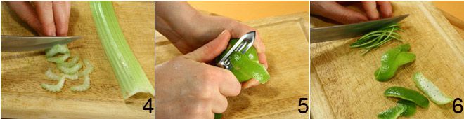 Waschen Sie den Sellerie, entfernen Sie die Fäden und schneiden Sie ihn in Scheiben von ½ cm Dicke 4; waschen Sie die Limette (oder eine Zitrone), trocknen Sie sie und entfernen Sie mit einem Sparschäler die Schale 5, ohne den weißen Teil (der leicht bitter sein kann) mitzunehmen; schneiden Sie die entfernten Schalen in feine Streifen 6.
