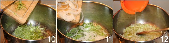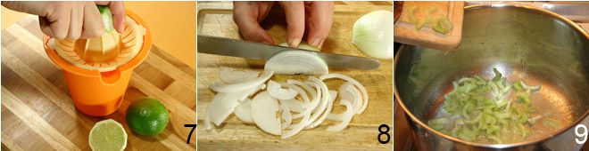 Pressen Sie die Limette aus 7 und stellen Sie den Saft beiseite. Schälen Sie die Zwiebel und halbieren Sie sie, dann schneiden Sie die beiden Hälften in Scheiben von 2-3 mm Dicke 8. In einem großen Topf lassen Sie die Butter schmelzen und fügen dann den Sellerie 9, die Limettenschalen 10 und die Zwiebel 11 hinzu;