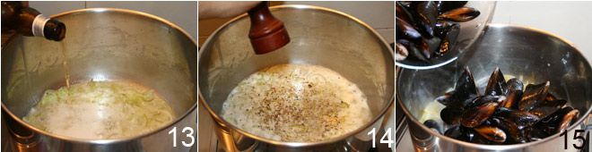 Kochen Sie die Zutaten für ein paar Minuten und fügen Sie dann den gemahlenen Pfeffer 14 und die Miesmuscheln 15 hinzu. Vermischen Sie die Zutaten gut und kochen Sie alles bei starker Hitze, bis sich die Muscheln vollständig geöffnet haben, dann schalten Sie die Hitze aus und servieren Sie sofort, begleitet von in Stäbchen geschnittenen Pommes frites.