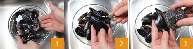Um die katalanischen Miesmuscheln zuzubereiten, beginnen Sie mit der Wie man Miesmuscheln reinigt und öffnet. Spülen Sie die Muscheln unter fließendem Wasser ab 1, entfernen Sie mit einem Messer Verkrustungen und Seepocken von den Muschelschalen. Entfernen Sie auch die Bartfäden, die aus den Schalen herausragen 2, und reiben Sie mit einem Stahlschwamm die Schalen, um verbleibende Verunreinigungen zu entfernen 3.
