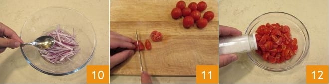 Fügen Sie nun auch den Essig hinzu 10. Lassen Sie sie etwa 10 Minuten einweichen, während Sie die Tomaten reinigen, indem Sie sie waschen und trocknen. Entfernen Sie den Stielansatz und schneiden Sie sie in Viertel 11. Legen Sie sie in eine Schale und würzen Sie sie mit Salz 12.