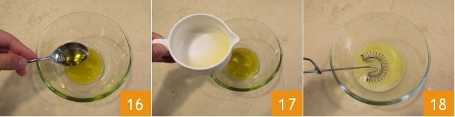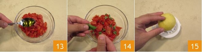 Fügen Sie das Öl hinzu 13 und würzen Sie mit grob zerkleinerten Basilikumblättern 14. Beiseite legen. Widmen Sie sich nun der Emulsion. Pressen Sie eine Zitrone 15 aus und gießen Sie den Saft in eine Schüssel.