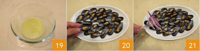 Das Endergebnis wird eine homogene Mischung sein 19. Jetzt servieren Sie die Miesmuscheln mit ihren Schalen auf einem Teller, eine neben der anderen, bis die gesamte Oberfläche des Tellers bedeckt ist 20. Legen Sie die abgetropfte Zwiebel gleichmäßig darüber 21.