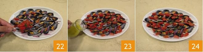 Legen Sie auch die Kirschtomaten über die Miesmuscheln 22 und würzen Sie mit der zubereiteten Emulsion 23. Ihre katalanischen Miesmuscheln sind jetzt bereit, warm oder kalt genossen zu werden!