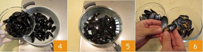 Übertragen Sie die Miesmuscheln dann in eine beschichtete Pfanne 4. Decken Sie sie mit einem Deckel ab und erhitzen Sie sie bei starker Hitze 5. Warten Sie, bis sich die Miesmuscheln öffnen, und rühren Sie gelegentlich um, um das Öffnen zu erleichtern. Es dauert etwa 7-8 Minuten. Nach dem Garen trennen Sie die Miesmuscheln und behalten nur eine der Schalen, in der sie befestigt sind 6. Behalten Sie sie beiseite.