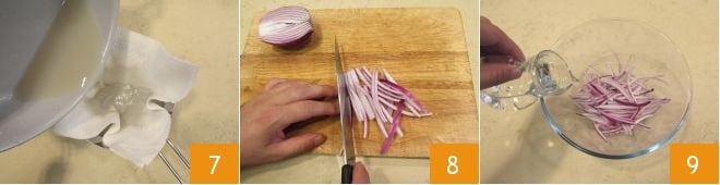 Filtern Sie das während der Zubereitung der Miesmuscheln freigesetzte Wasser, indem Sie es durch ein Tuch in eine kleine Schüssel gießen 7: Bewahren Sie die Flüssigkeit auf, die Sie für die Emulsion benötigen. In der Zwischenzeit schälen und putzen Sie die Zwiebel. Schneiden Sie sie nun in vier Viertel, aus denen Sie dünnere Scheiben schneiden 8. Legen Sie die Zwiebel in eine Schale mit kaltem Wasser 9.