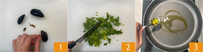 Um die Muscheln nach Matrosenart zuzubereiten, kümmern Sie sich zunächst um die Wie man Miesmuscheln reinigt und öffnet. Ziehen Sie den Bart heraus und spülen Sie sie ab 1. Hacken Sie dann die gewaschene Petersilie fein. Geben Sie das Öl in einen hohen Topf 3.