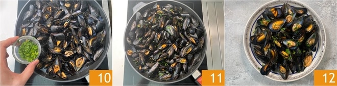 Die gehackte Petersilie hinzufügen 10, ein letztes Mal durchmischen 11 und die Muscheln nach Matrosenart heiß servieren 12!