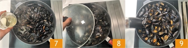 Mit Weißwein ablöschen 7 und die alkoholische Komponente verdampfen lassen, dann mit einem Deckel abdecken 8 und ca. 5 Minuten kochen, bis sie alle geöffnet sind. Bewegt den Topf hin und wieder, ohne den Deckel zu entfernen, um das Öffnen zu erleichtern. Fügen Sie nun den schwarzen Pfeffer hinzu 9.