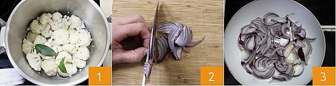 Um die Blumenkohlcreme mit Torcello zuzubereiten, waschen und reinigen Sie zuerst den Blumenkohl, schneiden Sie die Röschen ab und lassen Sie sie 10 Minuten (5 Minuten im Schnellkochtopf) in kochendem Salzwasser zusammen mit zwei Lorbeerblättern 1 kochen. Sobald sie gar sind, abgießen und abkühlen lassen. In der Zwischenzeit die Zwiebel in dünne Scheiben schneiden 2, eine Antihaftpfanne mit der Butter erhitzen und dann die geschnittene Zwiebel hinzufügen 3.