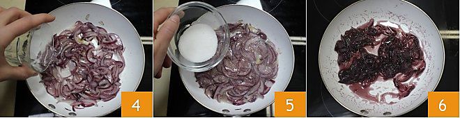 Wenn die Zwiebel zu brutzeln beginnt, fügen Sie das Wasser hinzu 4, lassen Sie es etwas einziehen und geben Sie dann auch den Zucker hinzu 5. Lassen Sie das gesamte Wasser einziehen und den Zucker leicht karamellisieren 6, das dauert etwa zehn Minuten. Dann vom Herd nehmen und die Zwiebeln beiseite stellen.