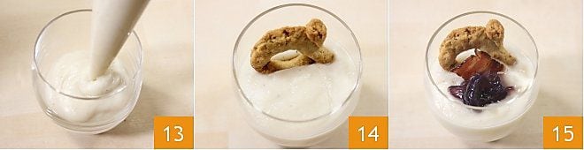 Nun die Gläschen zusammenstellen: die Blumenkohlcreme in 12 Gläser füllen (wenn Sie möchten, können Sie dies mit einem Spritzbeutel tun) 13, und jedes Gläschen mit einem Torcello 14, einer Scheibe knusprigen Specks und den karamellisierten Zwiebeln garnieren 15. So, die Blumenkohlcreme mit Torcello ist bereit zum Servieren!