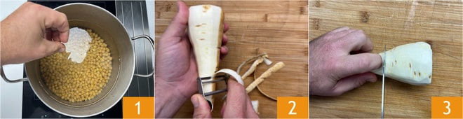Um die Kichererbsencreme mit Garnelen, Venusmuscheln und Pastinake zuzubereiten, legen Sie zuerst die getrockneten Kichererbsen in kaltes Wasser und lassen Sie sie über Nacht einweichen. Nach der Einweichzeit die Kichererbsen abseihen und in einen Topf geben, mit reichlich Wasser bedecken, salzen 1 und mindestens 2 Stunden kochen lassen. In der Zwischenzeit lassen Sie die Venusmuscheln ausspülen, indem Sie unserem Leitfaden folgen: Wie man Venusmuscheln reinigt. Gehen Sie zur Pastinake über: schneiden Sie die Enden ab, schälen Sie sie 2 und halbieren Sie sie 3.