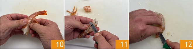 Widmen Sie sich nun den Garnelen: Entfernen Sie Kopf, Beine und Panzer 10. Schneiden Sie den Rücken der Garnele ein 11 und entfernen Sie den Darmfaden mit der Spitze eines kleinen Messers 12. Legen Sie die Garnelen auf ein mit Küchenpapier ausgelegtes Blech und bewahren Sie sie im Kühlschrank auf, bis Sie sie verwenden.