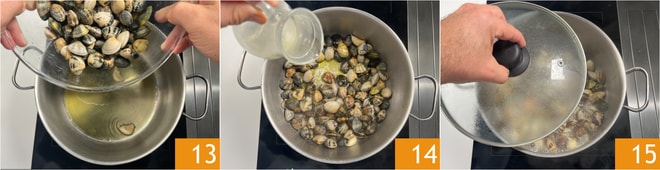 Nehmen Sie die gespülten Venusmuscheln, entfernen Sie tote oder zerbrochene, die Sand freisetzen könnten, und spülen Sie sie gut ab. Geben Sie Öl in einen Topf, fügen Sie 2 ungeschälte Knoblauchzehen hinzu und lassen Sie es aromatisieren. Wenn das Öl heiß ist, geben Sie die Venusmuscheln hinzu 13 und kochen Sie sie eine Minute lang. Rühren Sie um und löschen Sie mit Weißwein ab 14. Wenn der gesamte Alkohol verdampft ist, decken Sie den Topf mit einem Deckel ab 15, bis sich die Venusmuscheln vollständig geöffnet haben.