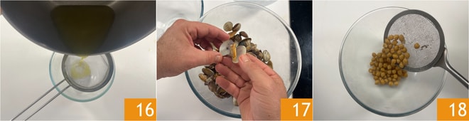 Wenn sie sich geöffnet haben, geben Sie die Venusmuscheln in eine Schüssel und filtern Sie die Flüssigkeit durch ein Sieb, dann beiseite stellen 16. Schalen Sie die Venusmuscheln 17, wobei Sie einige mit Schale für die endgültige Dekoration beiseite halten. Seihen Sie die Kichererbsen ab 18, wobei Sie das Kochwasser und eine Handvoll Kichererbsen für das Anrichten aufbewahren.